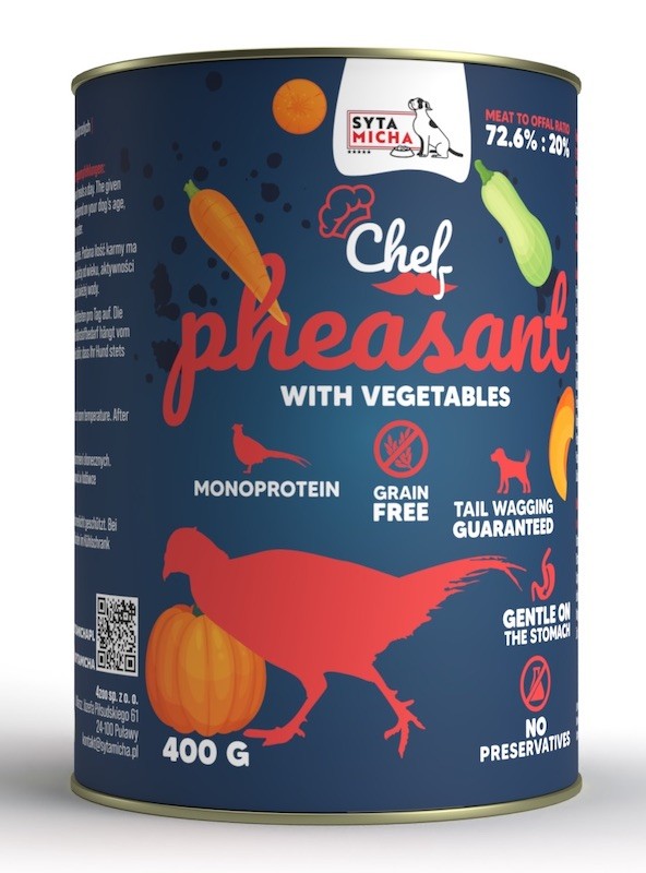 Strona główna » Sklep » Syta Micha Chef. Mokra karma dla psa Bażant z warzywami 400g