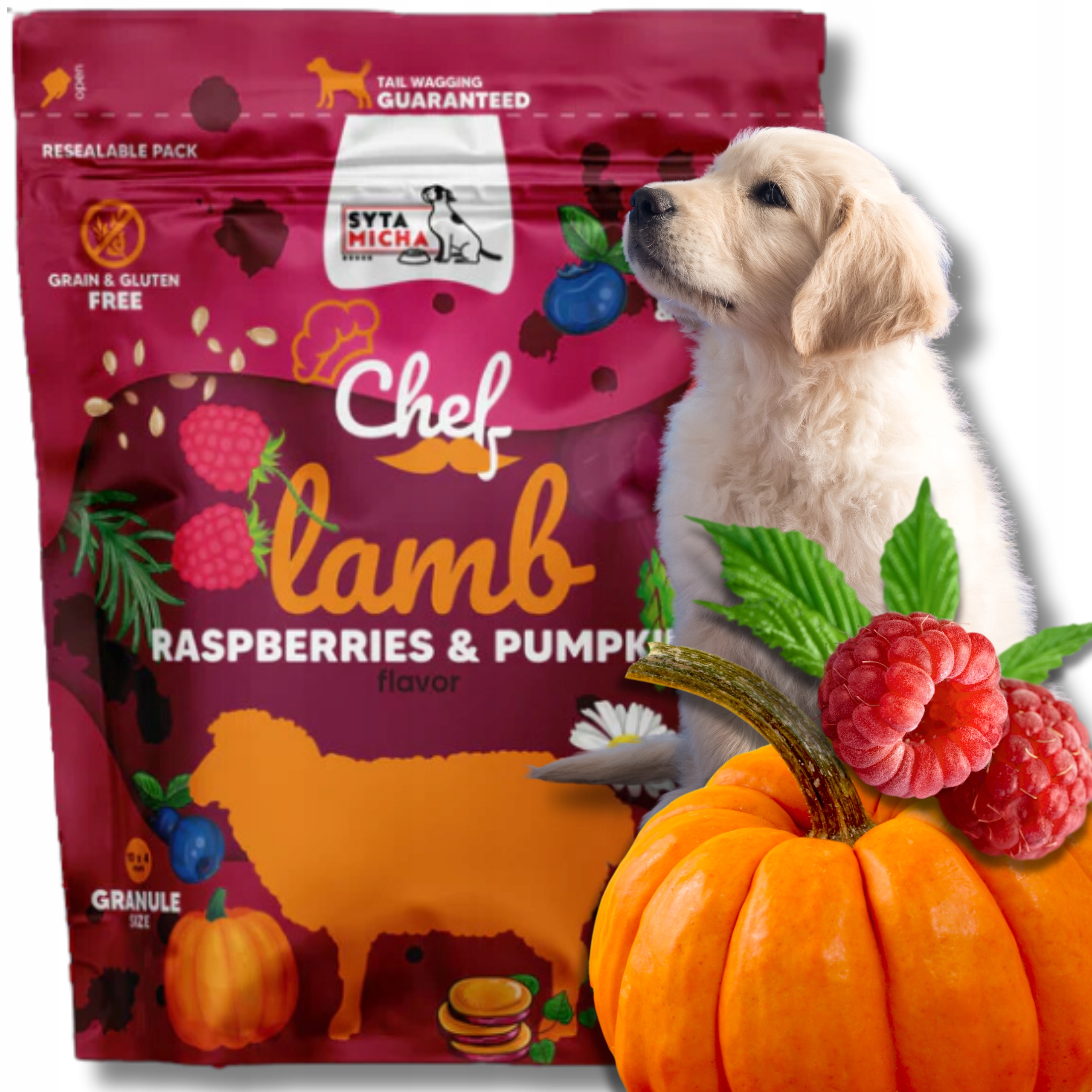 Strona główna » Sklep » Syta Micha Chef. Sucha karma dla szczeniąt Jagnięcina, malina i dynia 1.5kg