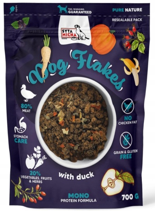 Syta Micha Dog Flakes kaczka to prawdziwy majstersztyk żywieniowy. Pełnoporcjowa formuła, która w składzie zawiera aż 80% najwyższej jakości mięsa kaczki, zaś pozostałe 20% to kombinacja odżywczych warzyw, owoców i ziół.