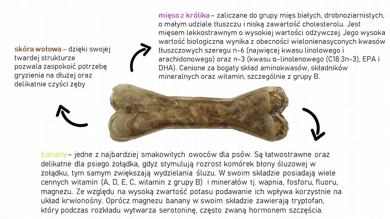 Te psie rarytasy powstały z nieprzetworzonych produktów, gdzie głównymi składnikami kości dla niejadków są: skóra wołowa, mięso z królika oraz banany.